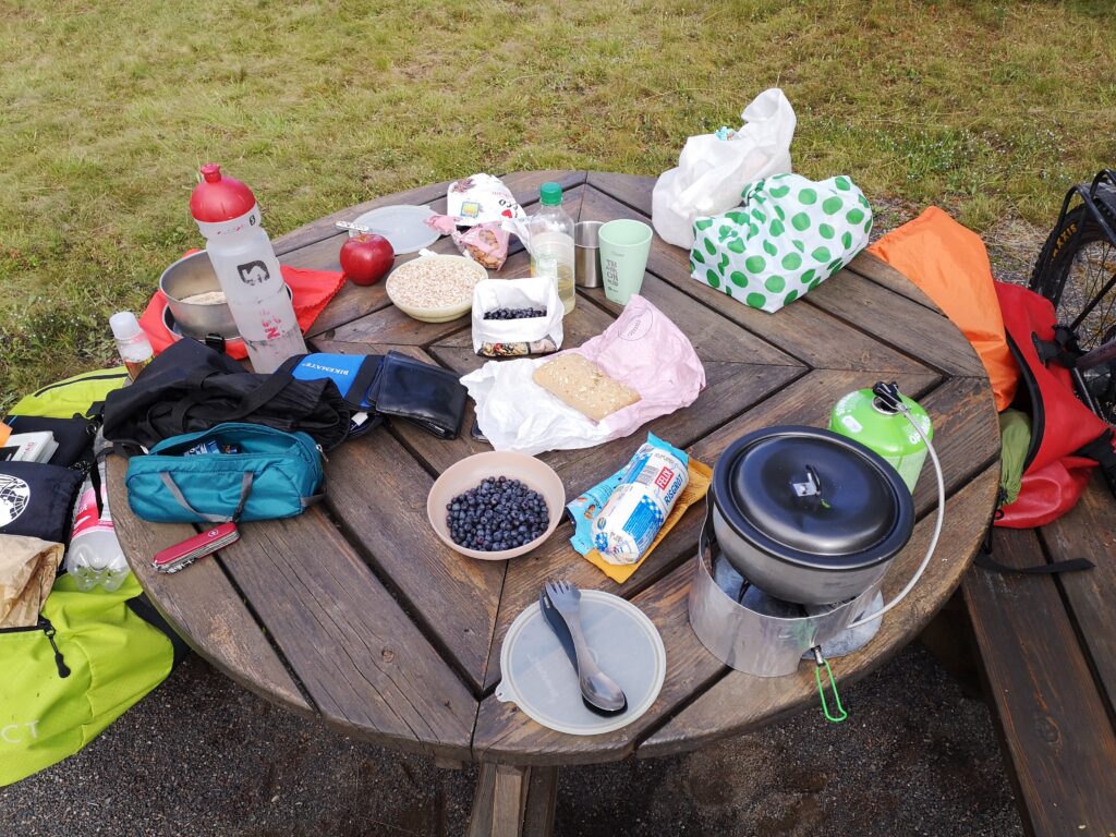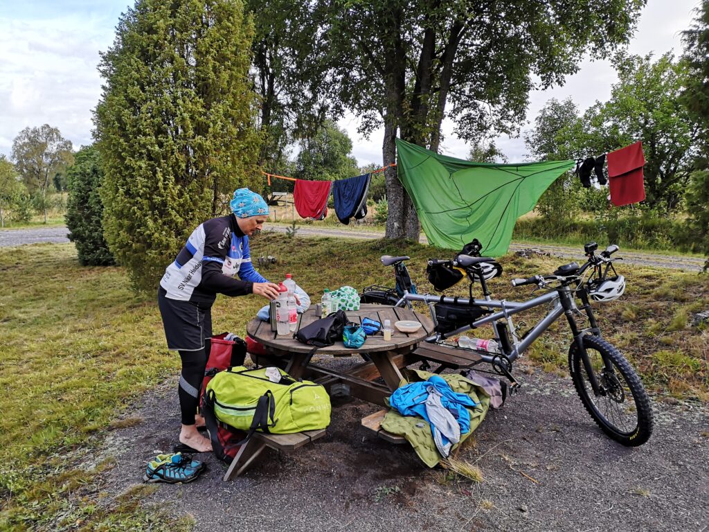 Es ist immer wieder erstaunlich, wie viel Geraffel man auf einem Tandem mitschleppen kann. Im Hintergrund alles, was vor der Weiterfahrt gelüftet und getrocknet werden sollte. Im Vordergrund Bekleidung für die kommende Etappe und erste Vorbereitungen für das Frühstück.