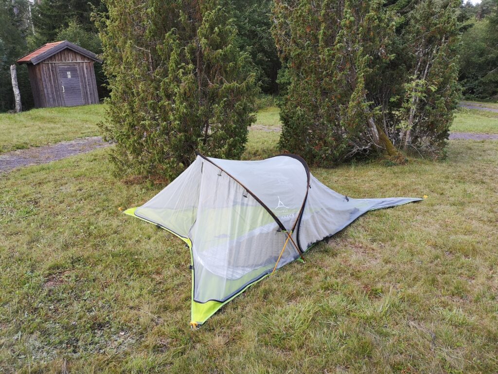 Während des Frühstücks erhält unser Zelt Gelegenheit, zu trocknen. Wegen einer gerissenen Naht haben wir uns ausnahmsweise dazu entschieden, es nicht zwischen Bäume zu hängen, sondern auf der Erde aufzubauen.