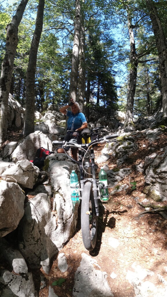 Nach etwa zwei Kilometern entpuppte sich Zavižan als kleine, wunderschöne Alm, hinter der es noch einmal kurz bergauf ging. Der Weg wurde immer steiniger und steiler, so dass wir teilweise sogar das Gepäck abnehmen mussten, um das Tandem nach oben zu tragen und nach unten zu schieben. Am Point of no Return wurde uns klar, dass Komoot uns auf einen veritablen, verblockten Wanderweg geschickt hatte.