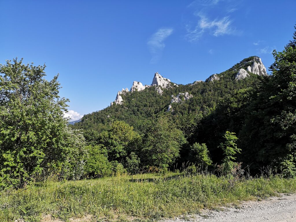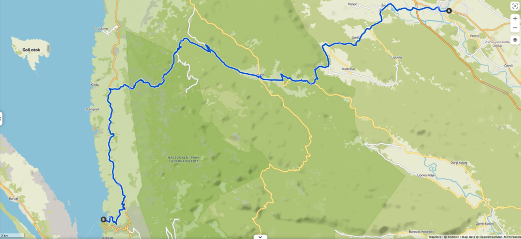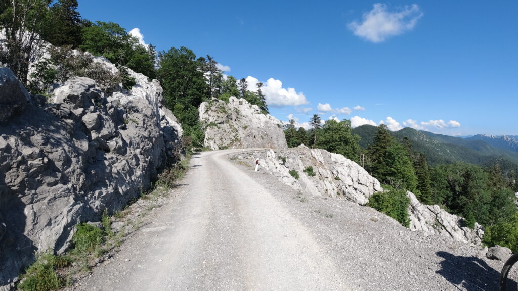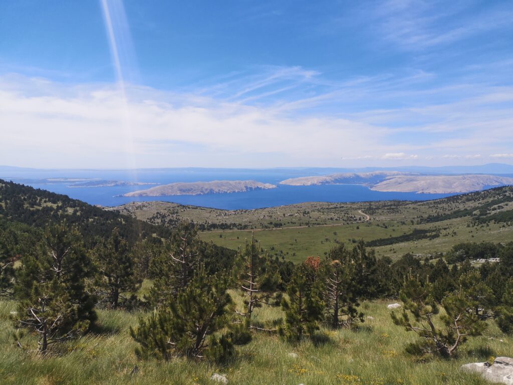 Am späten Vormittag beim Auffüllen unsere Wasservorräte haben wir unseren Hinweg gekreuzt und im selben Laden eingekauft wie eineinhalb Wochen zuvor. Dann ging es durch den Naturpark Velebit. Und, welch ein Glück – wir haben unseren ersten Bären in freier Wildbahn gesehen. Etwa 50 m vor uns hat er den Weg gekreuzt, ist dort für einige Sekunden verweilt und dann wieder im Wald verschwunden. Leider konnte ich in der Kürze der Zeit nur ein kurzes Video mit der DJI drehen, auf dem man den Bären nur undeutlich in der Ferne ausmachen kann.