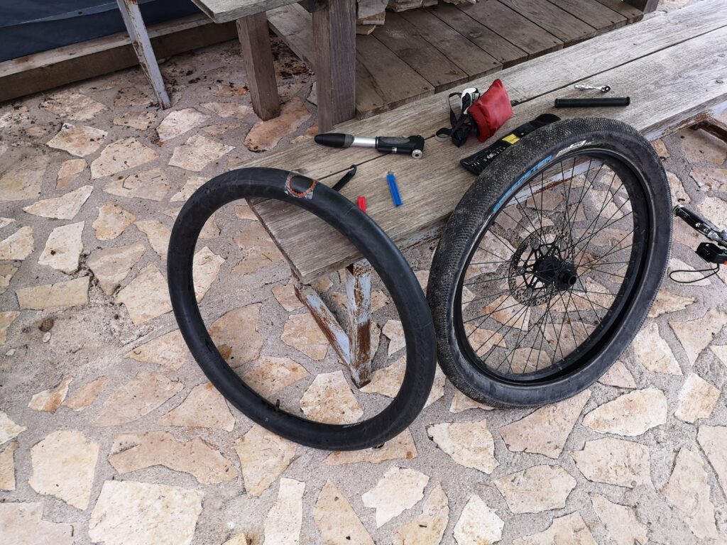 Bedeckter Himmel, keine saubere Wäsche und ein platter Vorderreifen – der Tag beginnt nicht sehr verheißungsvoll. Zum Glück sind wir auf einem Campingplatz und können bereits um 7 Uhr Waschmaschine und Trockner benutzen, noch vor dem Einsetzen des Regens unser Gepäck ins trockene Gemeinschaftszelt bringen und dort auch in Ruhe den Reifen flicken.