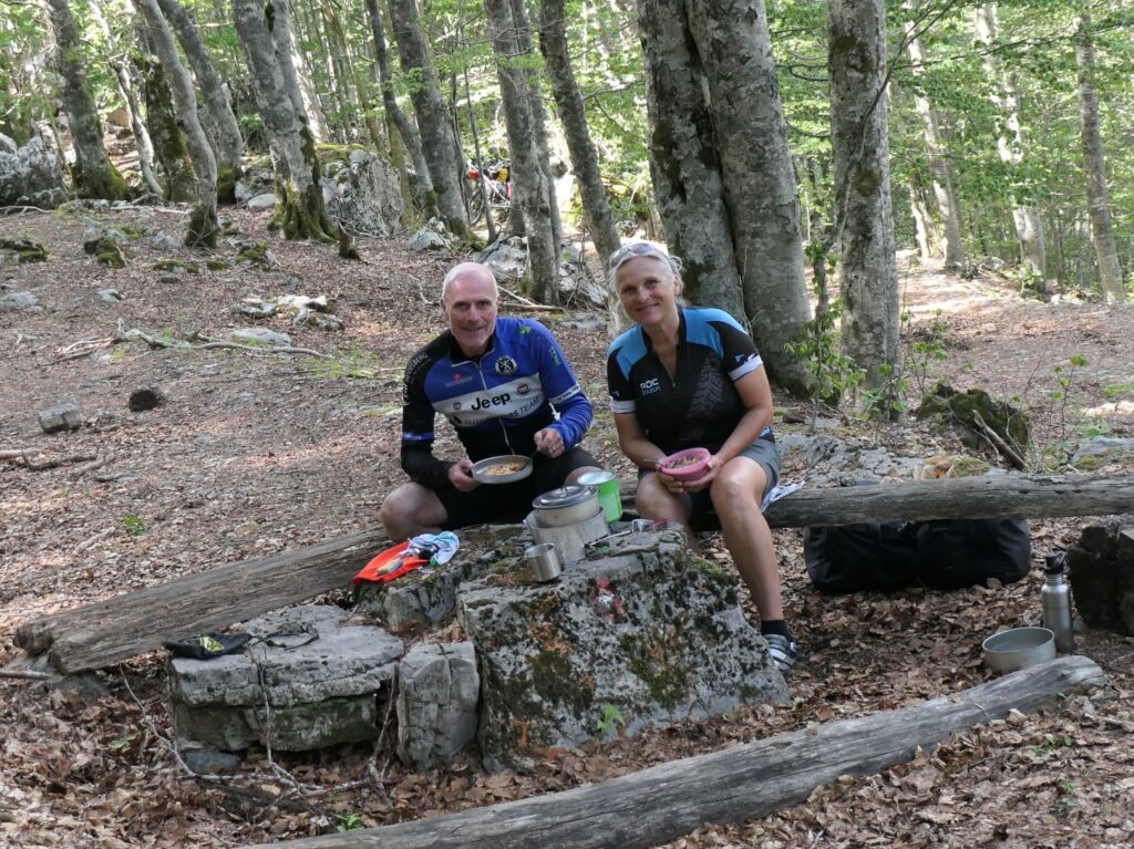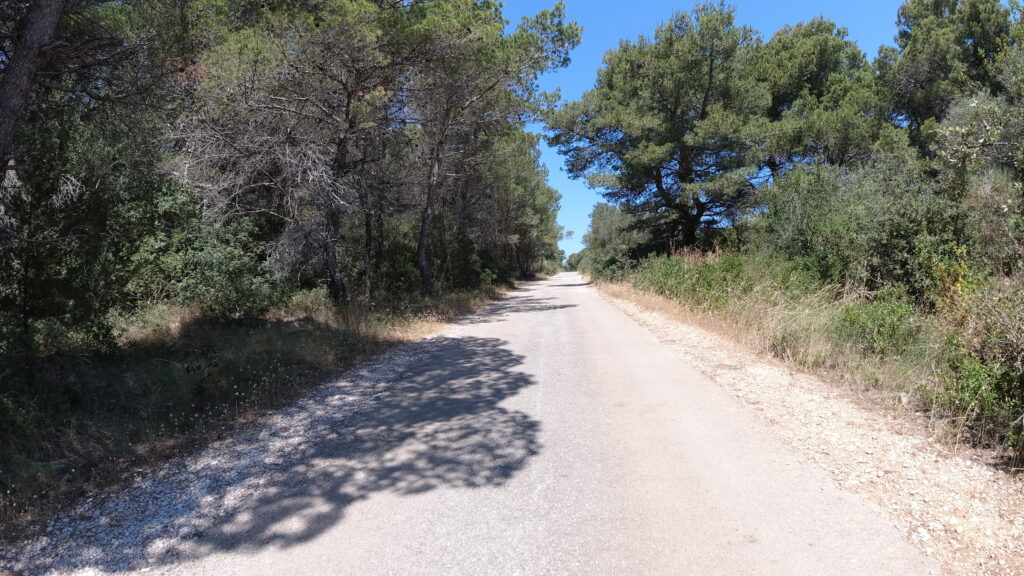 Am höchsten Punkt unserer Tour angekommen gab es eine schattige Ausspanne, an der wir unsere mitgebrachten Brötchen, Käse und Wurst verspeisten. 8 km durch den Wald bergab und 8 km flach an der Küste zum Hafen versprachen einen entspannten Nachmittag. Außerdem war der Waldweg für Autos gesperrt mit dem Hinweis, Zufahrt nur bis Zavižan und danach „blocked“.