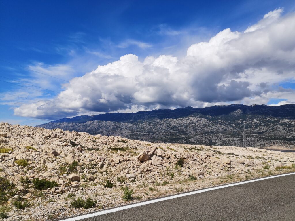 Den Tipp des Campingwarts, zwischen zwei Schauern ans Meer hinunter zu fahren, nehmen wir gerne an. Wir ändern deshalb unsere Reiseroute und entschließen uns, kurzfristig auf die Insel Pag überzusetzen. Wie das nachfolgende Foto von Pag aus zeigt, die richtige Entscheidung.