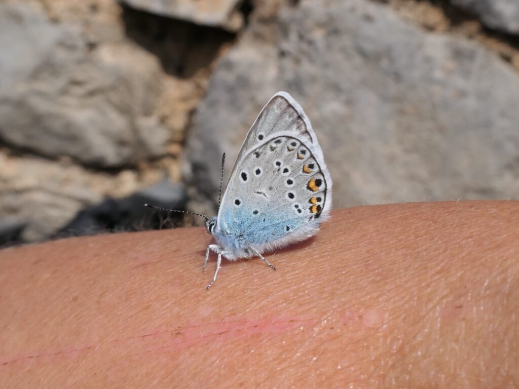 Einen Großteil der Reise begleiten uns wunderschöne, auf der Oberseite gelbe Schmetterlinge. Sobald sie sich allerdings auf eine Blüte setzen, falten sie sich zusammen und sehen aus wie ein ordinäres Blatt. Ein Foto im Flug ist mir noch nicht gelungen. Genauso wenig wie eines der Gams, die mich morgens um 5 Uhr beim Gang zur Toilette im Wald überrascht hat.