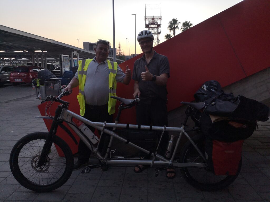 Kein Urlaubstag ohne Abenteuer. Nach einem zweistündigen Flug sind das Tandem, alle Gepäckstücke und wir gemeinsam in Tirana gelandet. Bei strahlendem Sonnenschein und zwei Stunden bis Sonnenuntergang haben wir uns entschieden, das Tandem am Flughafen aufzubauen und kein Taxi ins Hotel zu nehmen. Beim Einbau des Hinterrades mussten wir feststellen, dass die Bremsscheibe einen Schlag abbekommen hat und das Fahrrad nicht fahrtauglich ist.